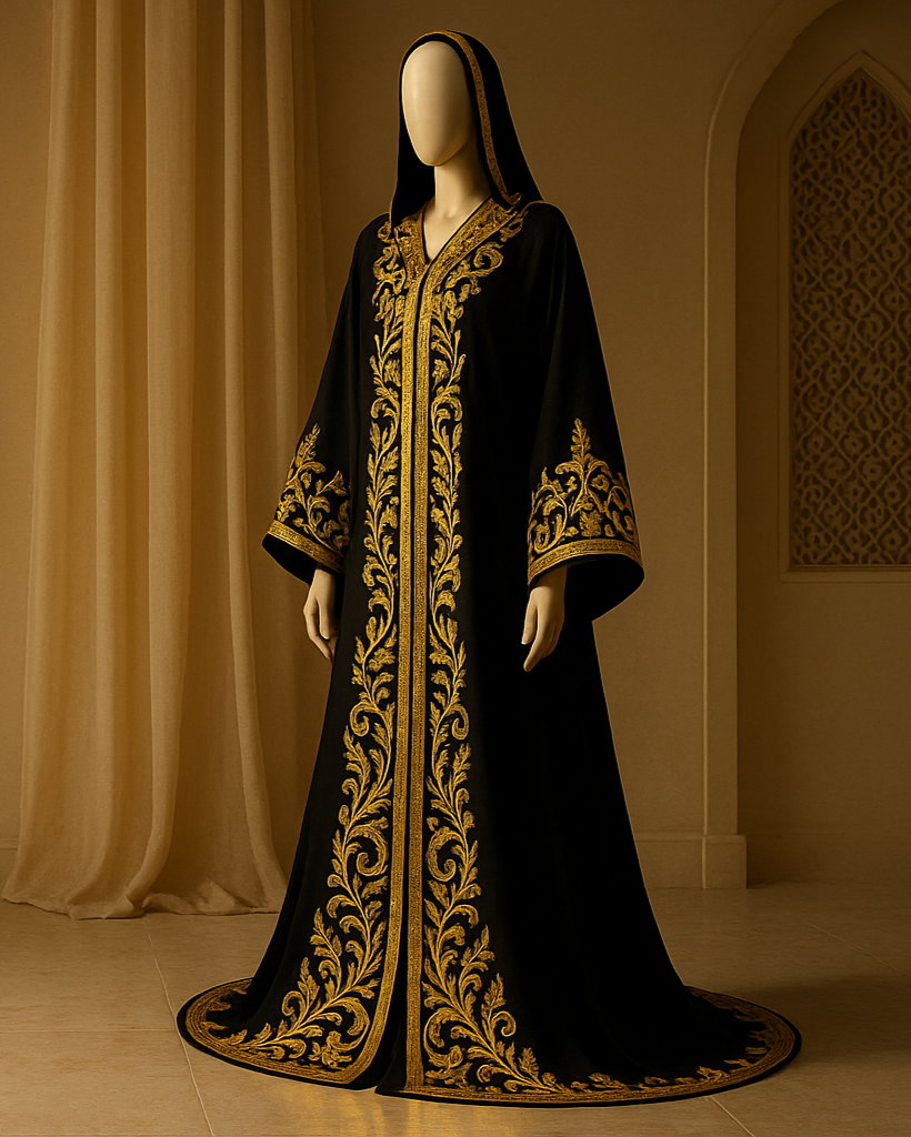 Elegant Nida Fabric Abaya for Women – V-Neck, Front Open with Dory Design with Handcrafted Detailing