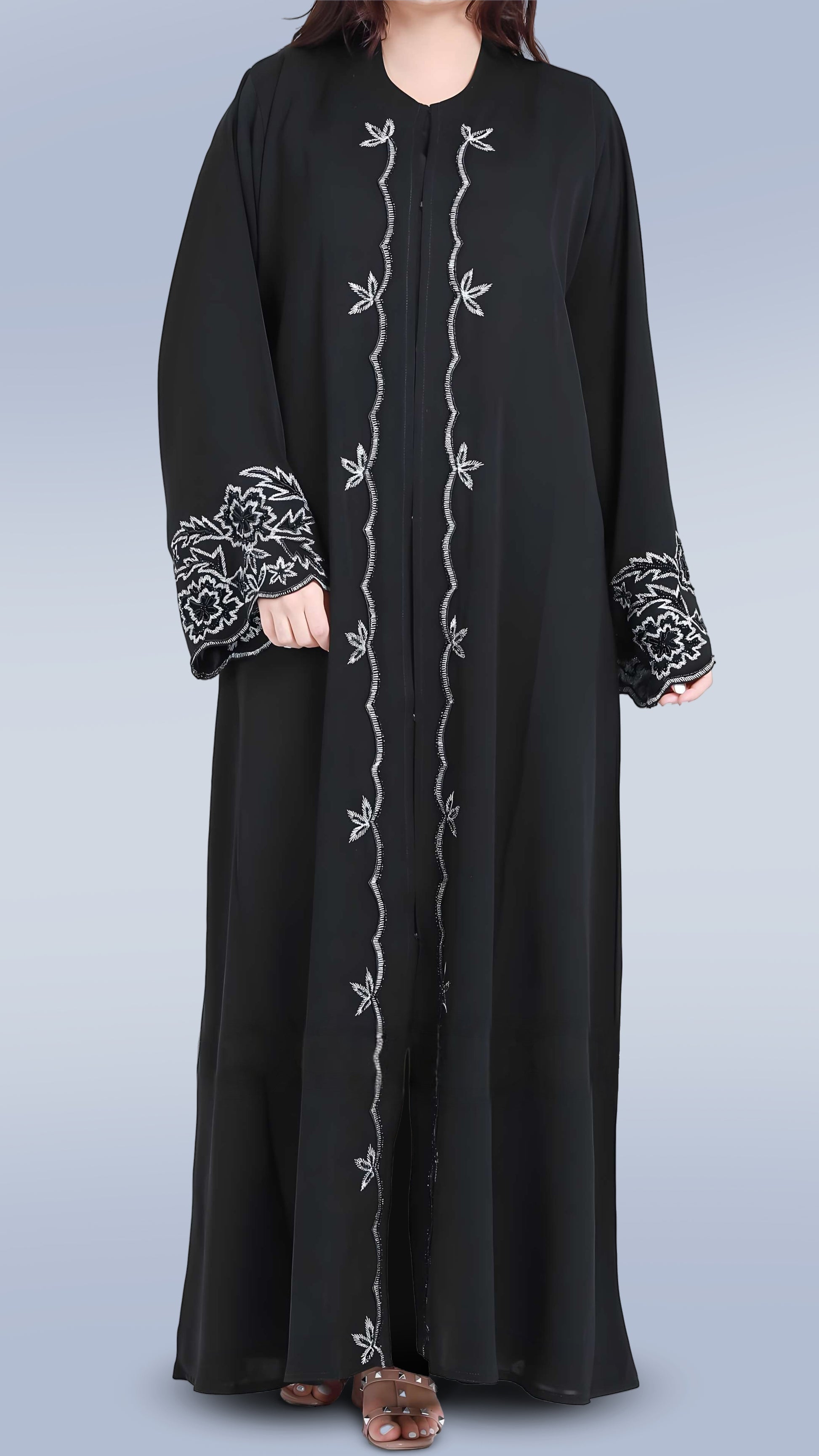 The Nida Black Abaya with Handwork & Embroidered Designs is the perfect fusion of simplicity and artistry, carrying the Malika Royals promise of grace, comfort, and everyday luxury.